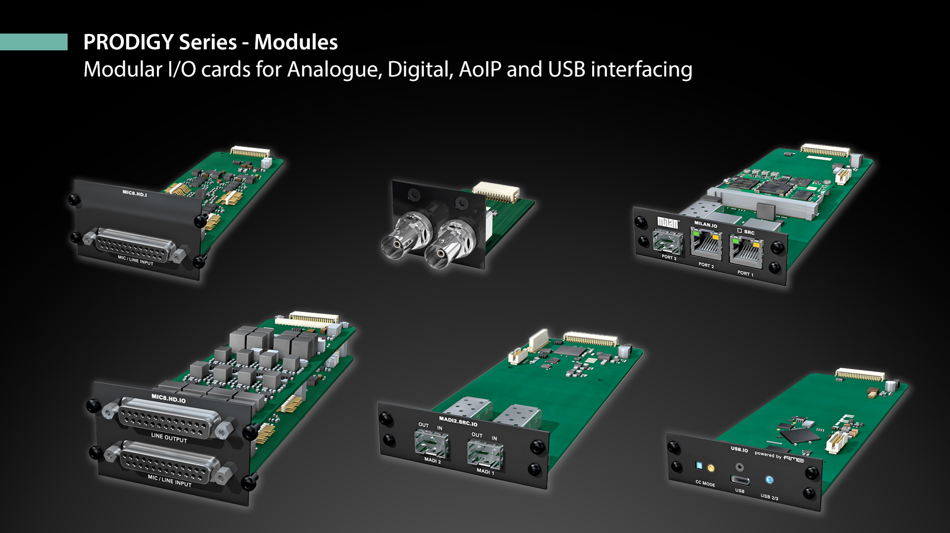 The PRODIGY.MP's I/O includes four local slots for analogue line-level/mic input and AES3 modules. With eight channels per module and interface direction, PRODIGY.MP provides up to 32 local inputs and outputs.