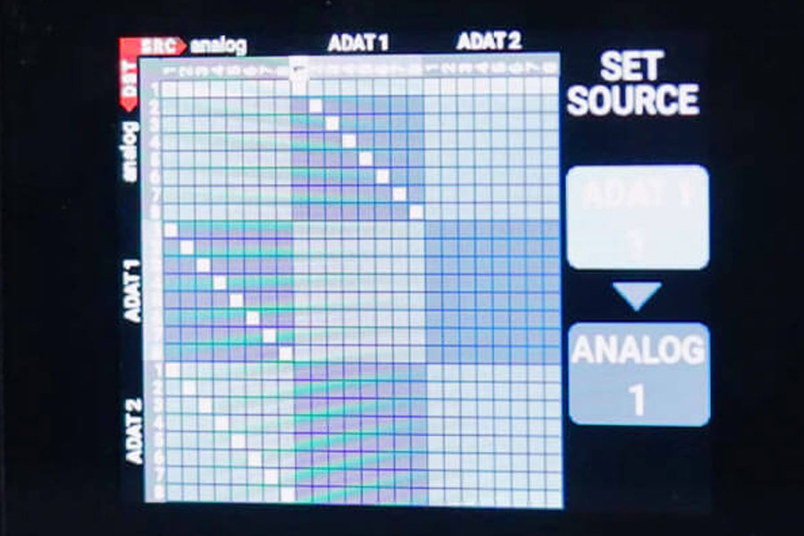 The front panel TFT display shows the levels of all 16 analogue inputs and outputs as well as the status of the device. Pressing the MENU button takes you to the main menu from where the device can be set up.