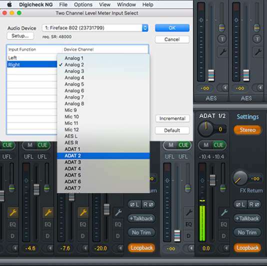4 – Open DIGICheck NG, select the instrument you would like to activate, and choose your Loopback Channel’s corresponding input from the drop-down menu (ADAT 1 and ADAT 2 in our example).