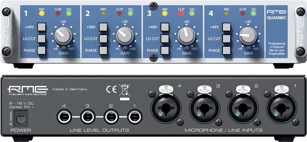 It’s worth noting that preamps can also feature analogue or digital gain controls. Several RME devices feature analogue gain pots on their front panels, such as the RME Octamic II and QuadMic preamps, and the RME Fireface 802 interface.