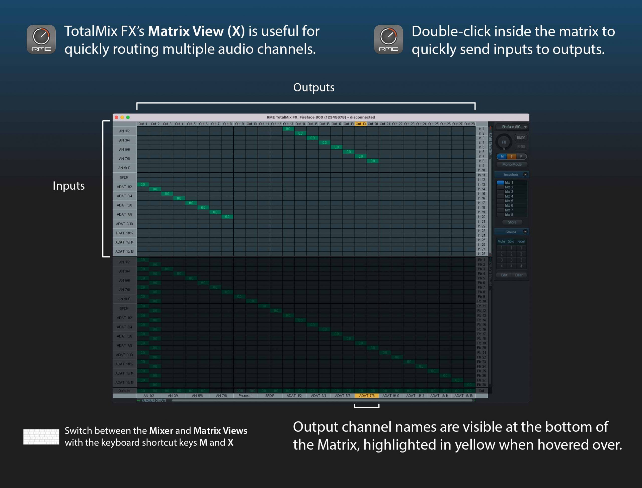 - 5. At the same time, you can send signals out through the Fireface 800’s analogue outputs via your newer interface’s ADAT outputs 1–8 (bottom-row in TotalMix FX).