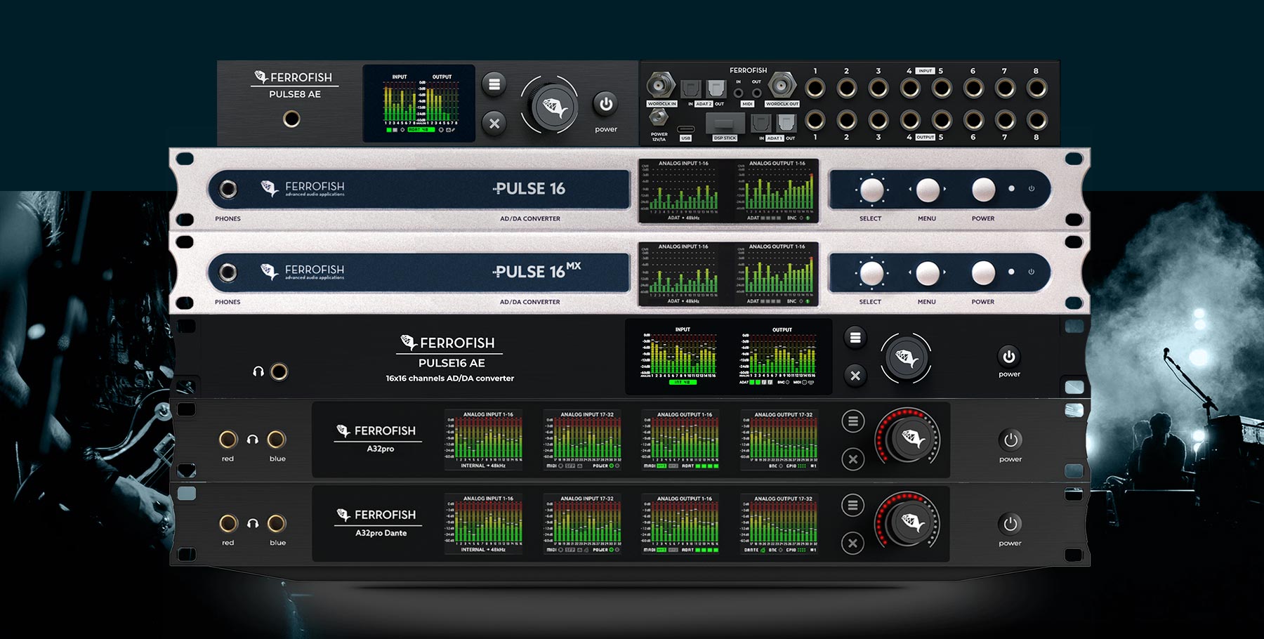 High-quality AD/DA converters from German manufacturer Ferrofish, for expanding your studio or live rig with 16 channels (PULSE Series) or 32 channels (A32 Series).